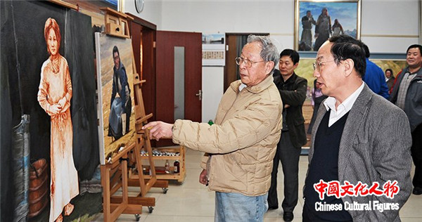 张老师创作态度认真严谨,不允许有一点马虎,一点瑕疵。我第一次去张老师画室时,见墙上挂着一幅名为《红土高原上的欢笑》的油画,表现的是云南傣族青年男女欢快跳舞的场景,构图活泼,色彩帅气。几个月后我再到他画室时,发现这幅作品的色彩对比更加强烈明快,原来张老师竟然又改了一遍。再往后一段时间,张老师对个别人形象又做了调整。《彭德怀在抗日前线》这幅画,原始资料是一张清晰度很低的照片。为了创作,张老师到北京周边山区找同样场景拍照片,画写生,从军事博物馆借来八路军用过的手摇电话机进行参照。在接受国家重大题材《祖冲之》和《张衡》创作任务后,他多次到中科院请教专家,到博物馆查找资料。画面铺完调子,形象初步呈现出来后,张老师又将专家请到画室提意见。所有这些的目的,就是要使自己画面上出现的科学仪器不是主观臆造,服饰符合时代特征,作品更接近历史真实。